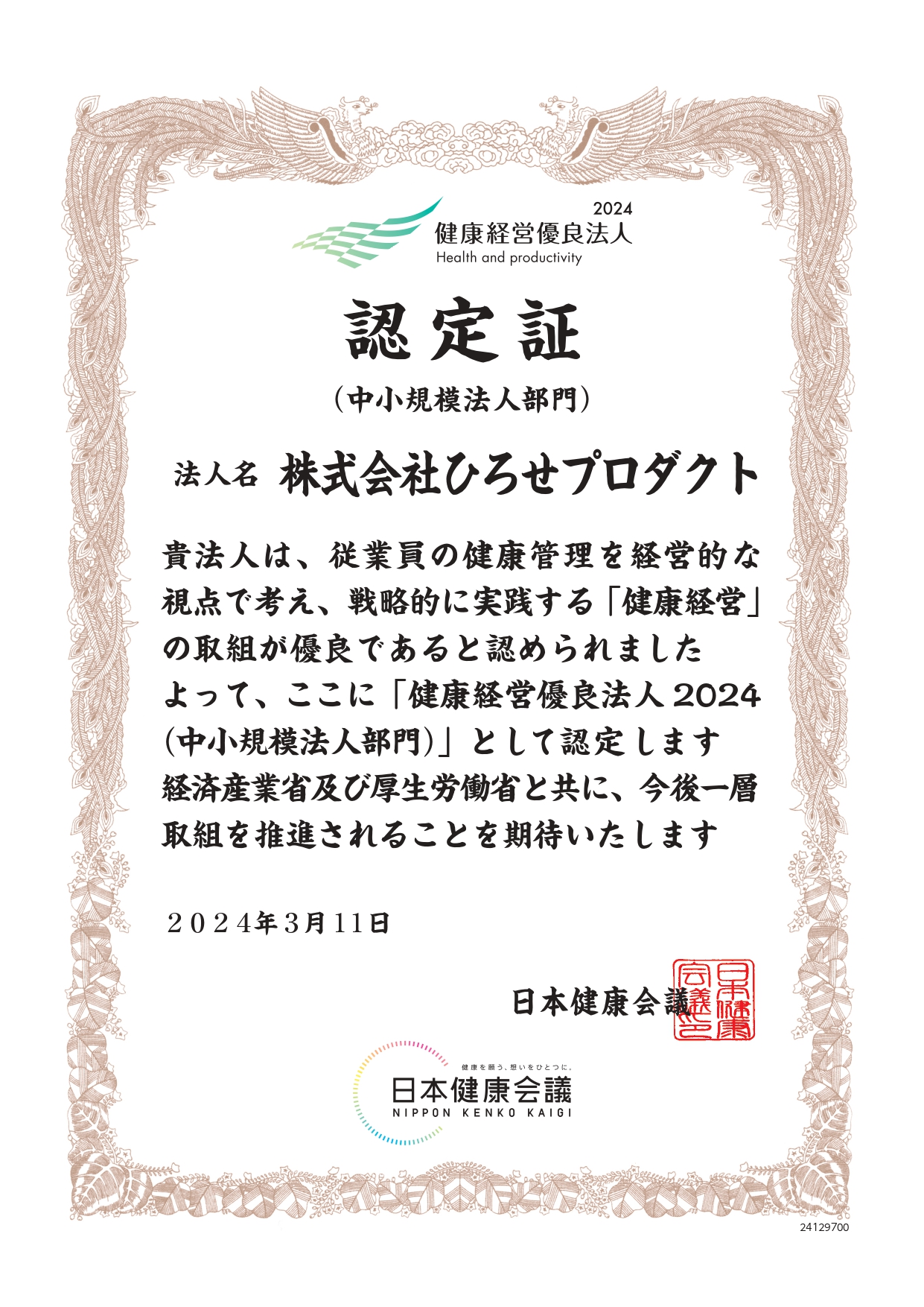 本日、健康経営優良法人2024の発表がありました。 株式会社ひろせプロダクトも認定されました! https://kenko-keiei.jp/houjin_list/